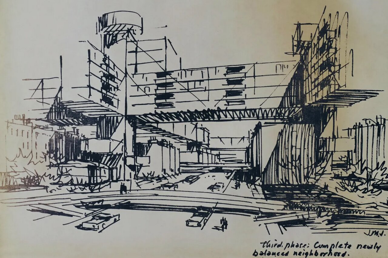 جان یوهانسن، رؤیاپرداز معماری، طرحی را در ذهن داشت که میتوانست محله جدیدی را در بالای هارلم شرقی در نیویورک ایجاد کند و شاید میتوانست حتی نوسازی شهری را تغییر دهد. او ایده «Leapfrog City» (شهر جهشی) را برای منطقهای پردردسر به نام مثلث هارلم شرقی توسعه داد. این ایده با الهام از تأسیسات صنعتی بزرگتر و راهآهنهای ریلی، از روبنایی پیشساخته از برجهای فولادی ده تا دوازده طبقه، برای ایجاد مسکن در بالای ساختمانهای موجود ارائهشده بود.
