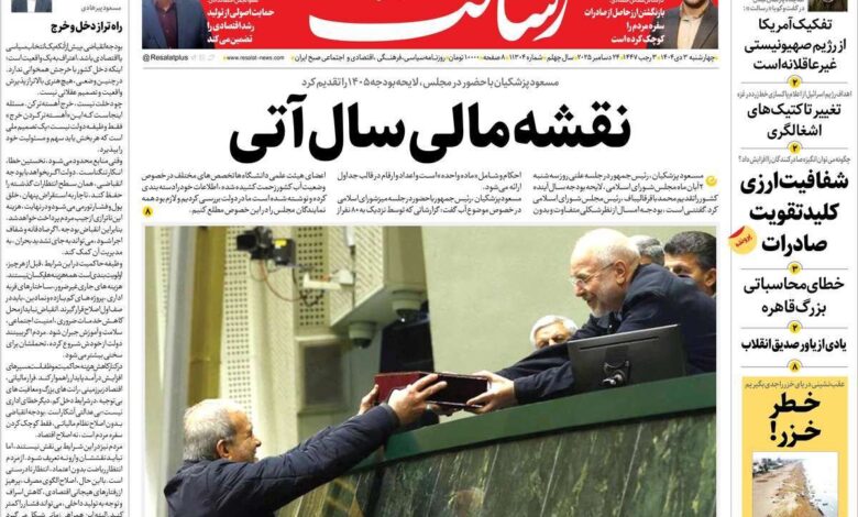 جزئیات لایحه بودجه 1405 و سخنان ردیس جمهور در باره ان در مجلس از تیترهای مطبوعات امروز است.