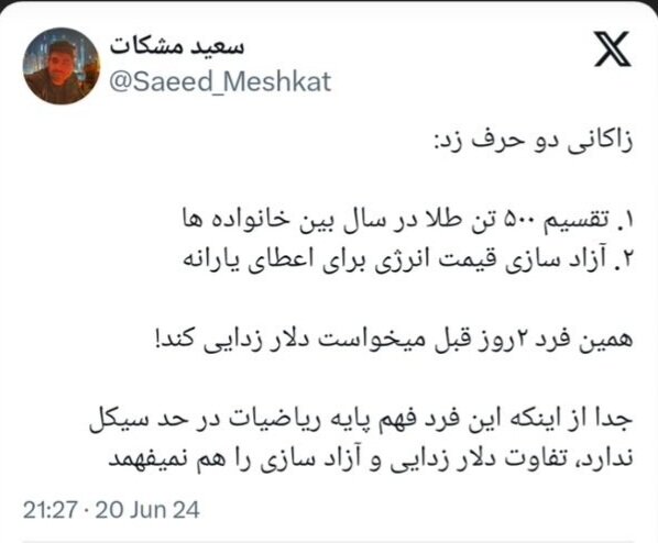 وی عنوان کرد: همین فرد دو روز قبل میخواست دلارزدایی کند! جدای از اینکه این فرد فهم پایه ریاضیات در حد سیکل ندارد، تفاوت دلارزدایی و آزادسازی را هم نمیفهمد.