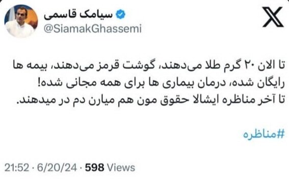 او در توئیتی دیگر عنوان کرد: تا الان ۲۰ گرم طلا میدهند، گوشت قرمز میدهند، بیمهها رایگان شده، درمان بیماریها برای همه مجانی شده. تا آخر مناظره ایشالا حقوق مون هم میارن دم در میدهند!