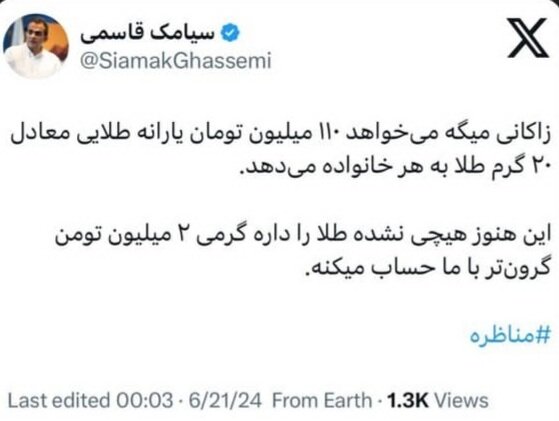 سیامک قاسمی، اقتصاددان هم در توییتر نوشت: زاکانی میگوید ۱۱۰ میلیون تومان یارانه طلایی معادل ۲۰ گرم طلا به هر خانواده میدهد. این هنوز هیچی نشده، طلا را داره گرمی ۲ میلیون تومان گرانتر با ما حساب میکند!