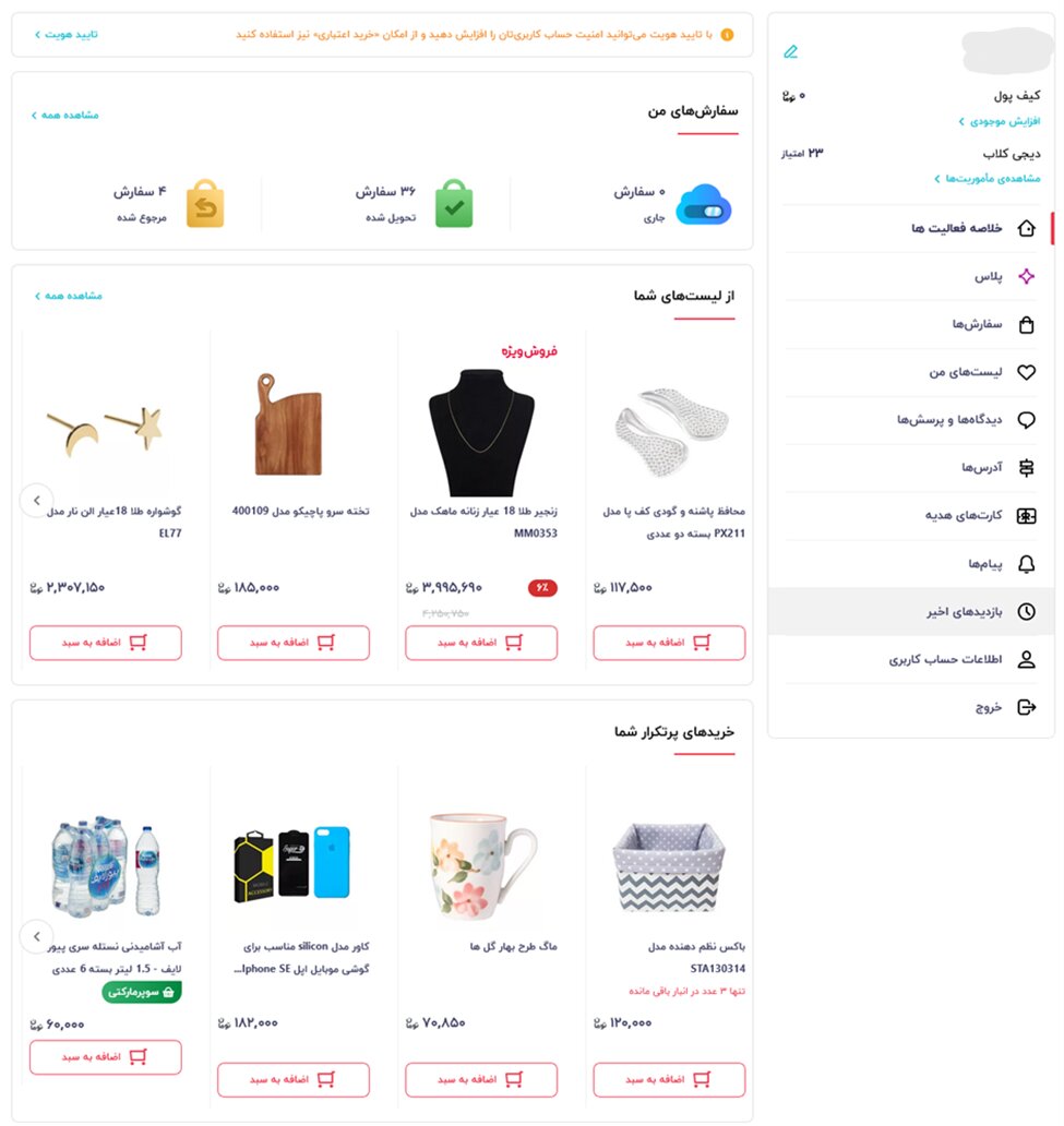حالا در این صفحه دو ستون اصلی میبینید که در آن موضوعاتی دستهبندی شده است. ستون سمت راست خلاصهای سریع از هویت شما مانند نام و نام خانوادگی، شماره تلفن، کیف پول، دیجیکلاب میدهد و زیر آن «خلاصه فعالیتها»، «پلاس»، «سفارشها» و… قابل مشاهده است. در ستون سمت چپ هم میتوانید به بخش «سفارشهای من»، «از لیستهای شما» و «خریدهای پرتکرار شما» دسترسی داشته باشید.
