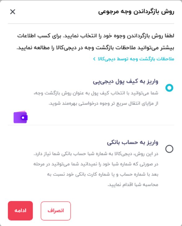به صورت پیشفرض روش بازگرداندن وجه مرجوعی روی گزینه «واریز به کیف پول دیجیپی» قرار دارد که در این روش پول شما سریعتر به جیب شما منتقل میشود و میتوانید بلافاصله مجددا با همان پول از دیجیکالا خرید کنید.
