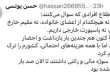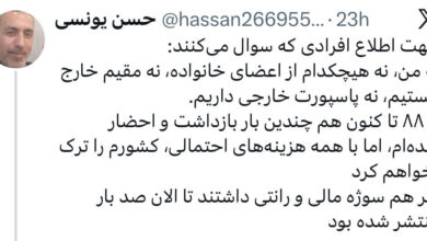 واکنش فرزند علی یونسی وزیر سابق اطلاعات به حواشی فضای مجازی؛ نه من، نه هیچکدام از اعضای خانواده، نه مقیم خارج هستیم، نه پاسپورت خارجی داریم
